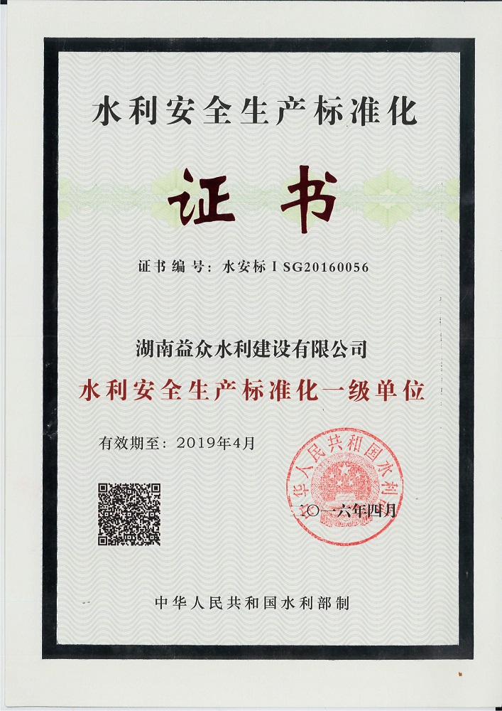 我公司榮獲水利安全生產(chǎn)標(biāo)準(zhǔn)化一級單位