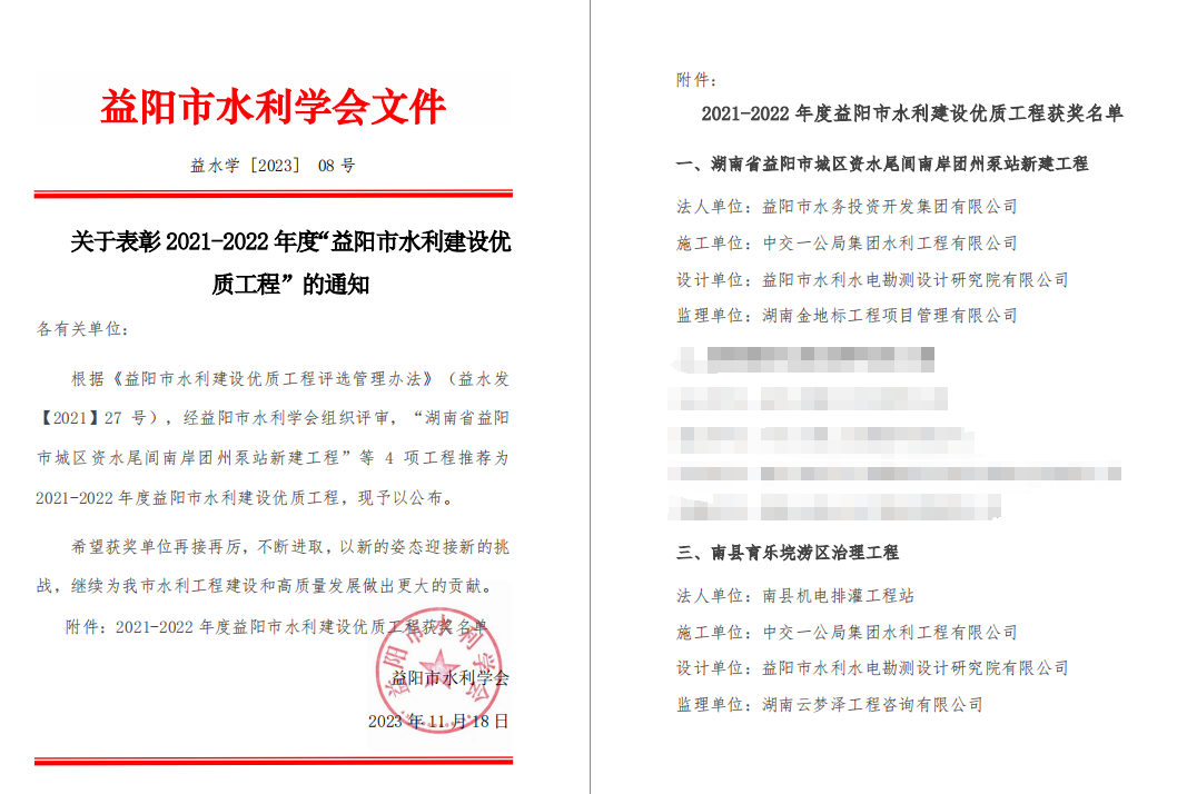 近日,益陽市水利學(xué)會公布了關(guān)于表彰2021-2022年度“益陽市水利建設(shè)優(yōu)質(zhì)工程”的通知,公司承建的湖南省益陽市城區(qū)資水尾閭南岸團洲泵站新建工程和南縣育樂垸澇區(qū)治理工程榜上有名,被列為2021-2022年度益陽市水利建設(shè)優(yōu)質(zhì)工程。