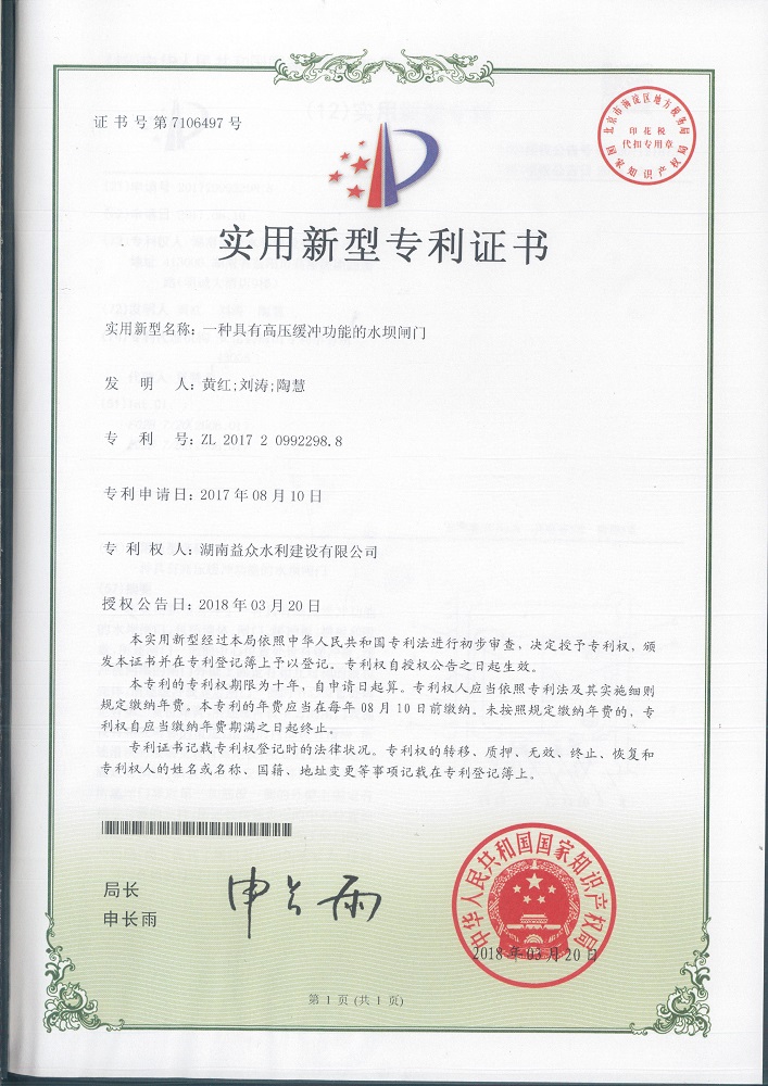 本實(shí)用新型公開了一種具有高壓緩沖功能的水壩閘門,包括墻體、閘門、緩沖板、橫板和吸盤,所述閘門一側(cè)的中心位置處設(shè)有緩沖板,緩沖板兩端的閘門外壁上固定有相互對(duì)稱的限位殼體,所述緩沖板靠近閘門一側(cè)的中心位置處固定有第二復(fù)位彈簧,所述緩沖板下方的閘門表面設(shè)有相互對(duì)稱的滑道,滑道的內(nèi)部設(shè)有滑塊,所述滑塊的頂端安裝有固定板,所述固定板的底端固定有橫板,橫板的底端安裝有等間距的尖體,所述閘門靠近第一加筋板一側(cè)的外壁上固定有相互對(duì)稱的立柱,所述鉸接軸表面的中心位置處固定有伸縮柱。本實(shí)用新型不僅實(shí)現(xiàn)了閘門的緩沖功能,而且提高了閘門對(duì)地面的抓緊力,提高了閘門在截水過(guò)程中的牢固程度。