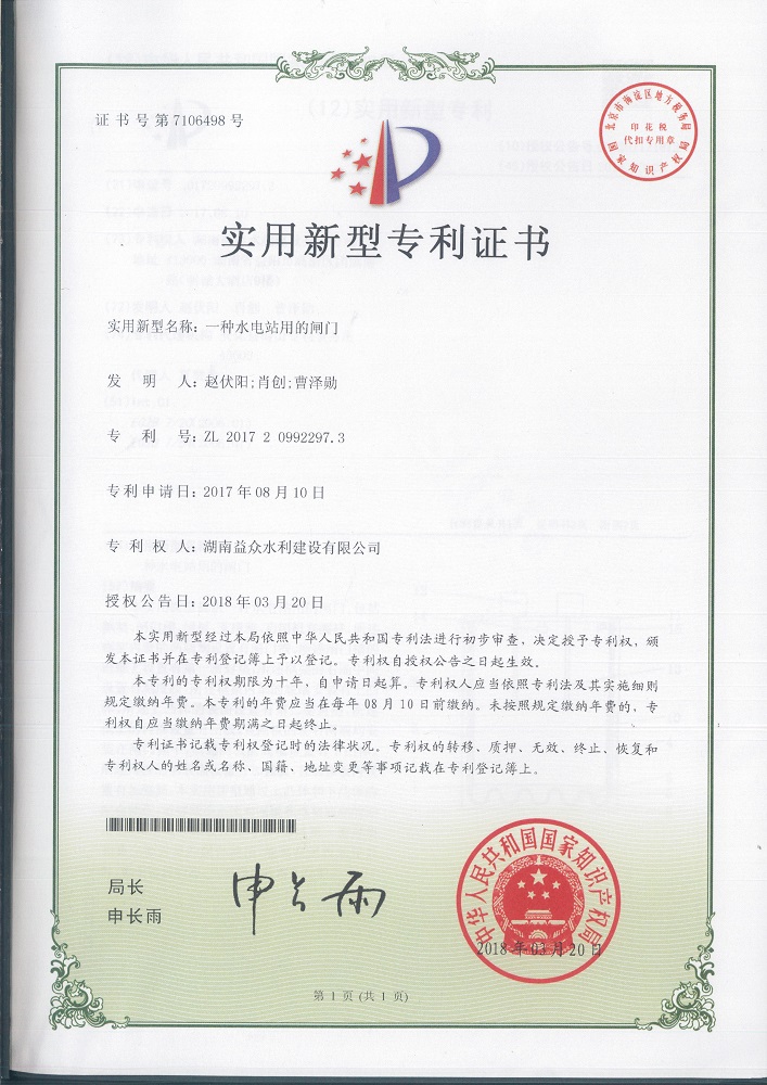 本實用新型提供一種水電站用的閘門,包括框架、閘門槽、閘板、支撐座、啟閉機和閥桿,所述框架內(nèi)壁的兩端均設(shè)置有閘門槽,所述閘門槽的內(nèi)壁上設(shè)置有第一密封墊,所述框架的右端中間設(shè)置有刻度線,所述框架內(nèi)部的底端安裝有上凸體,所述上凸體的表面設(shè)置有第二密封墊,所述框架的內(nèi)部設(shè)置有閘板,且閘板的左右兩端均安裝在閘門槽中,所述閘板的底端設(shè)置有下凸體,所述閘板的前表面設(shè)置有加強板,且加強板內(nèi)設(shè)置有加強筋。本實用新型通過上凸體和下凸體的配合使用,能夠減少水流對閘板和框架底部的沖擊力,從而延長閘板使用壽命,通過第一密封墊和第二密封墊的配合使用,能夠在閘板未開啟時,處于密封狀態(tài),從而增加其蓄水功能。