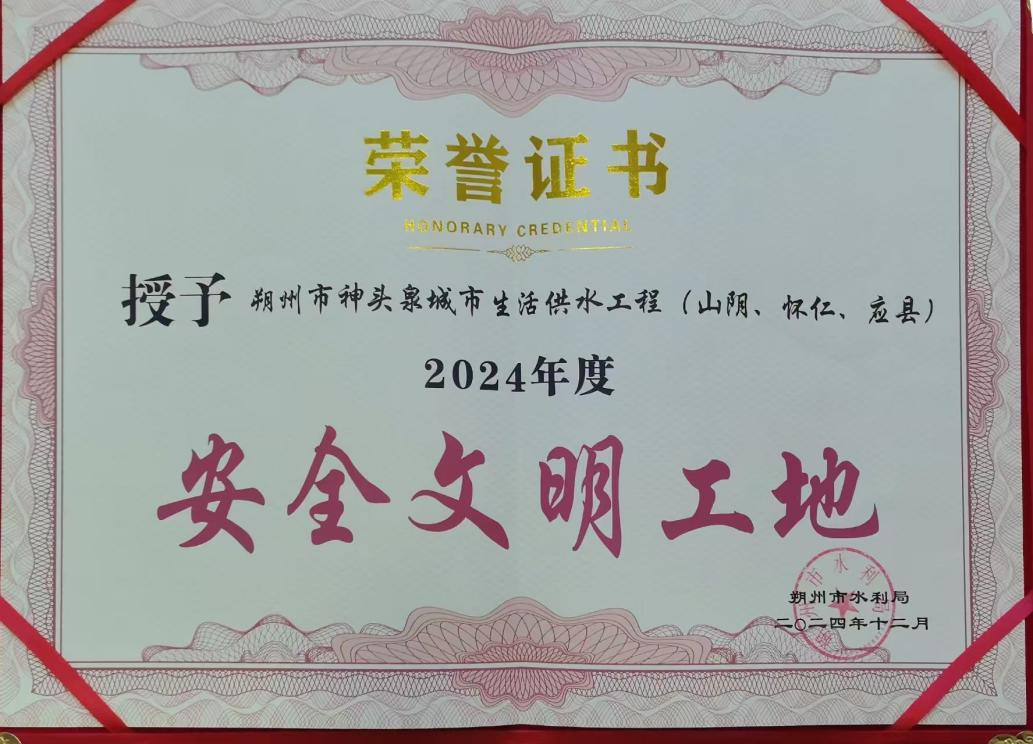 近日,公司朔州市神頭泉城市生活供水工程項目在全市安全文明工地評選中脫穎而出,榮獲“2024年度安全文明工地”獎項。