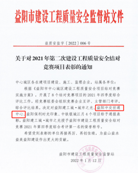 1月21日,公司益陽中交世通中心項目在益陽市2021年第二批建設(shè)工程質(zhì)量安全結(jié)對項目點評會中榮獲第二名,獲得通報表彰,并喜得流動紅旗一面。