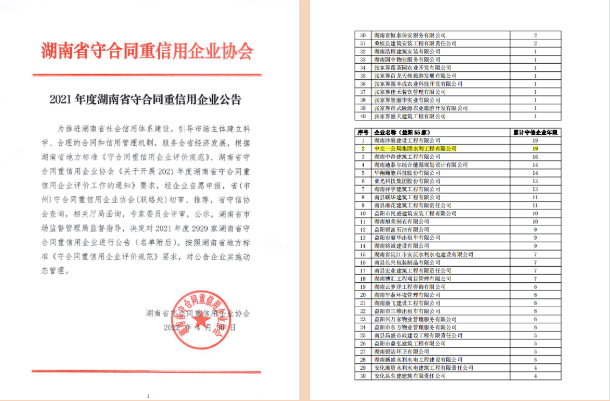 近日,湖南省守合同重信用企業(yè)協(xié)會公布了“2021年度湖南省守合同重信用企業(yè)”考核結(jié)果,公司榮獲“2021年度湖南省守合同重信用企業(yè)”稱號。至此,公司已連續(xù)19年斬獲此項殊榮。