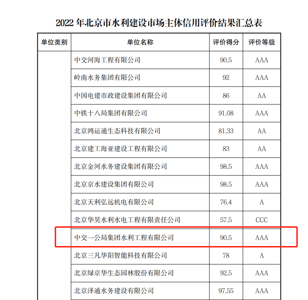 近日,公司榮獲北京市水務(wù)局授予的水利建設(shè)市場(chǎng)主體信用評(píng)價(jià)AAA 級(jí)(最高級(jí))榮譽(yù)。