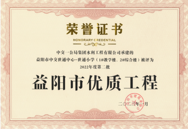 近日,公司益陽市中交世通中心-世通小學(1#教學樓、2#綜合樓)項目被評為2022年度第二批益陽市優(yōu)質(zhì)工程。