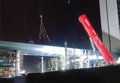 建設(shè)過程中,項(xiàng)目部將吊裝時(shí)間定在晚上,最大限度降低對市政交通的影響和安全風(fēng)險(xiǎn)。3月16日晚8點(diǎn)至3月17日凌晨3點(diǎn),公司領(lǐng)導(dǎo)親臨督戰(zhàn),項(xiàng)目管理人員堅(jiān)守崗位,歷時(shí)7小時(shí),順利完成人行天橋鋼箱梁吊裝工作。后續(xù),項(xiàng)目將快速完成鋼箱梁梁段在臨時(shí)支架上的焊接成型任務(wù),并隨即開展橋面附屬工程施工。