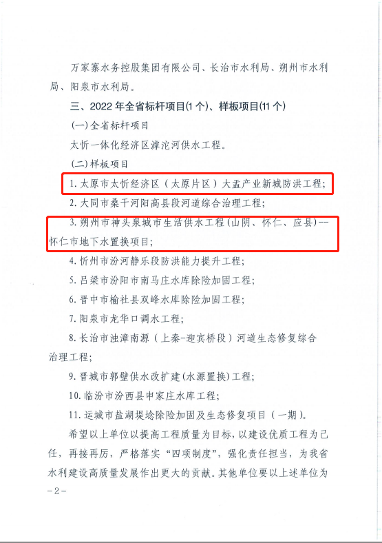 近日,山西省水利廳公布了關(guān)于2022年水利工程建設(shè)樣板項目和標(biāo)桿項目的通報,公司承建的太原市太忻經(jīng)濟區(qū)(太原片區(qū))大盂產(chǎn)業(yè)新城防洪工程和朔州市神頭泉城市生活供水工程(山陰、懷仁、應(yīng)縣)—懷仁市地下水置換項目榜上有名,被列為山西省2022年水利工程建設(shè)樣板項目。